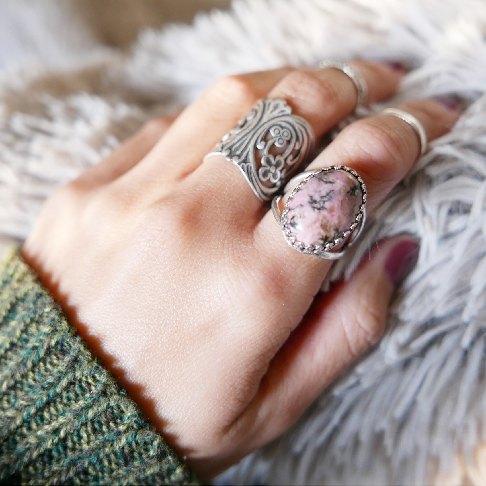 Natural rhodochrosite ring