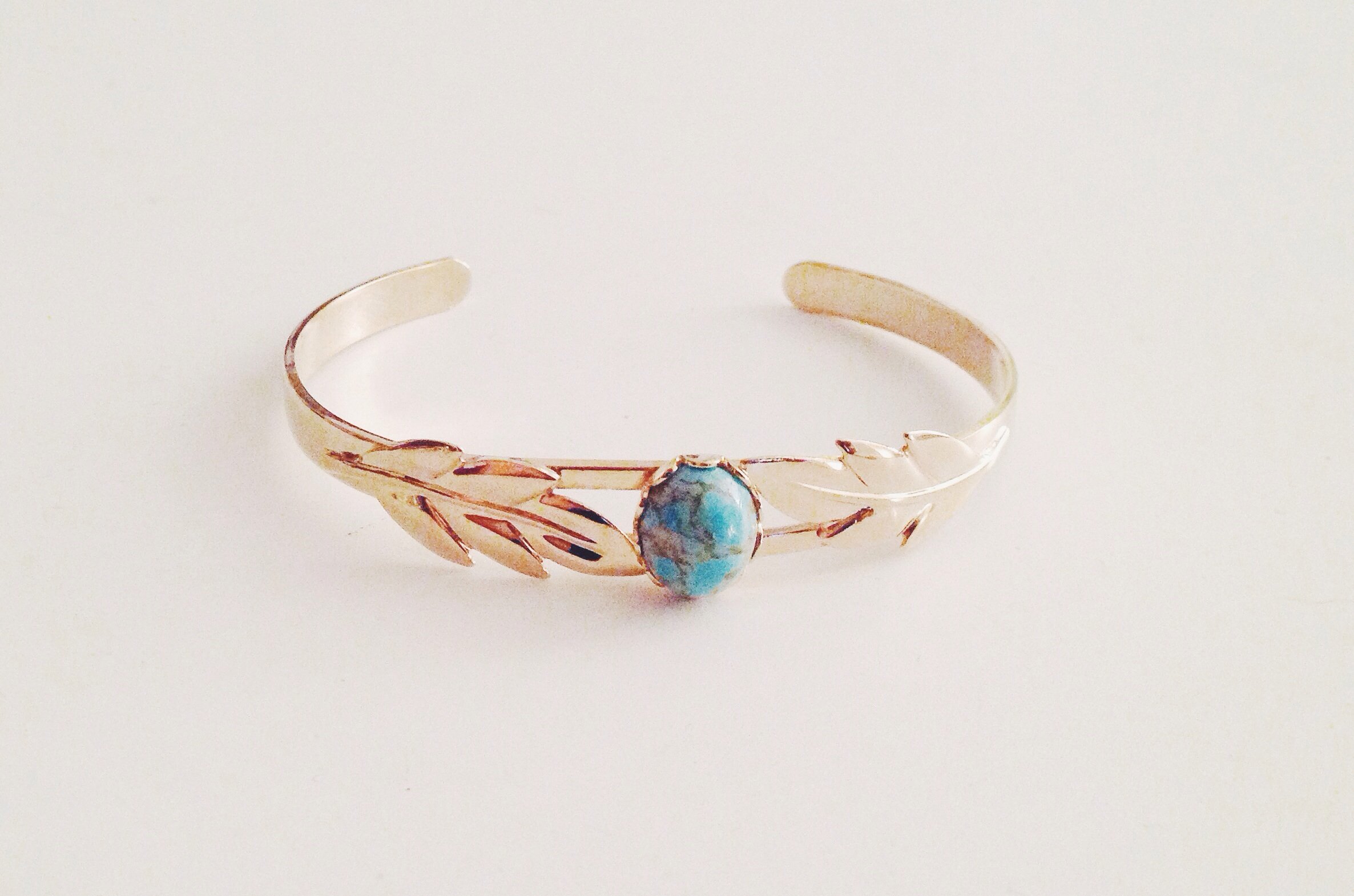 Vintage turquoise matrix leaf bangle. • Adjustable • Gold Plated • Stone measures 1.0cmx0.8cm