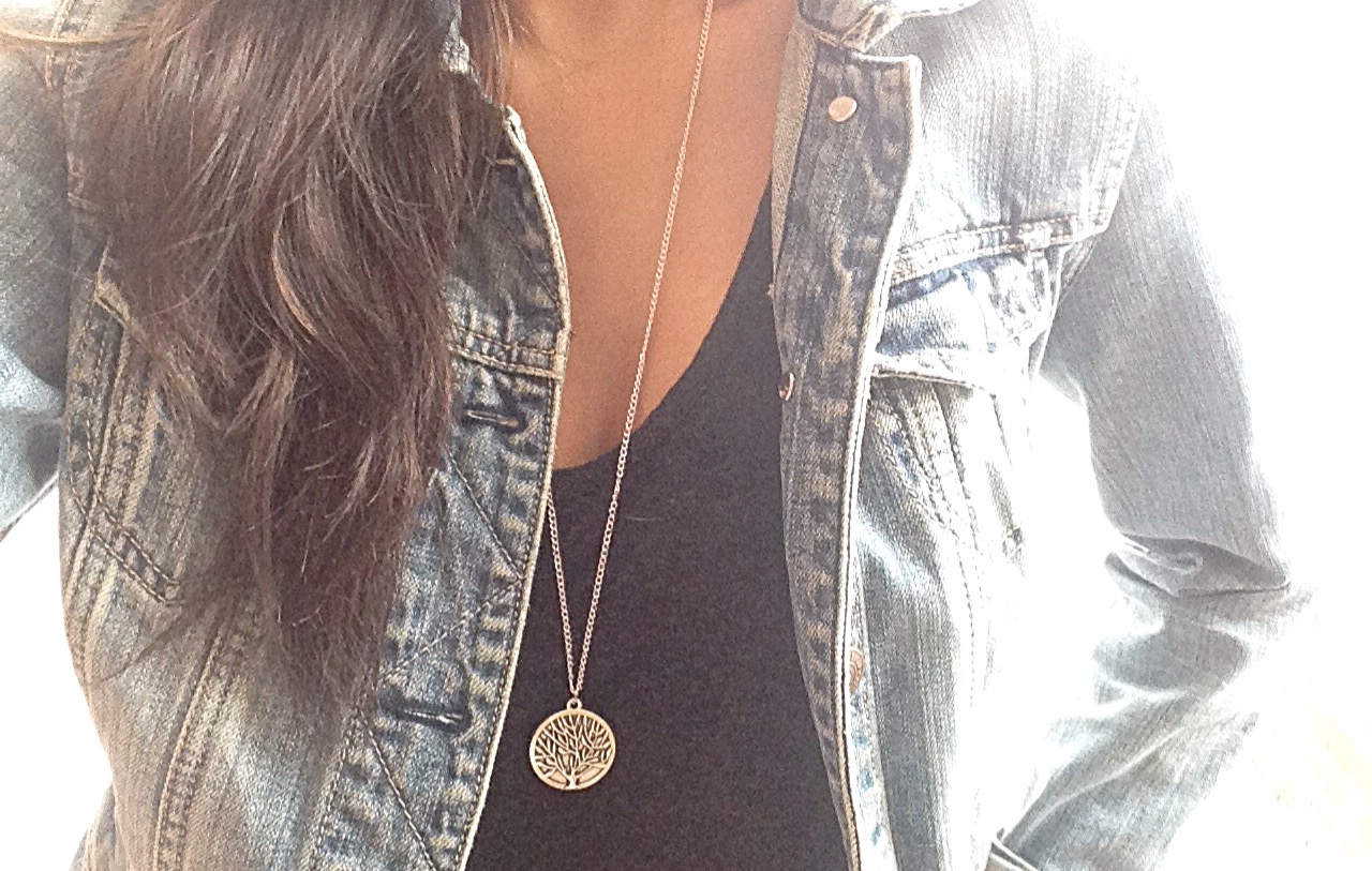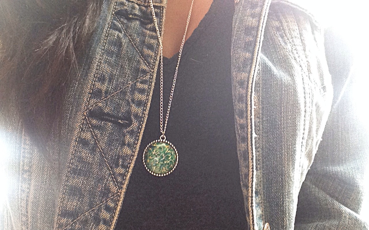 Reversible tree of life pendant • silver plated 30" link chain • measures 25mm • one side has the tree of life stamp and green opal stone on the other side.
