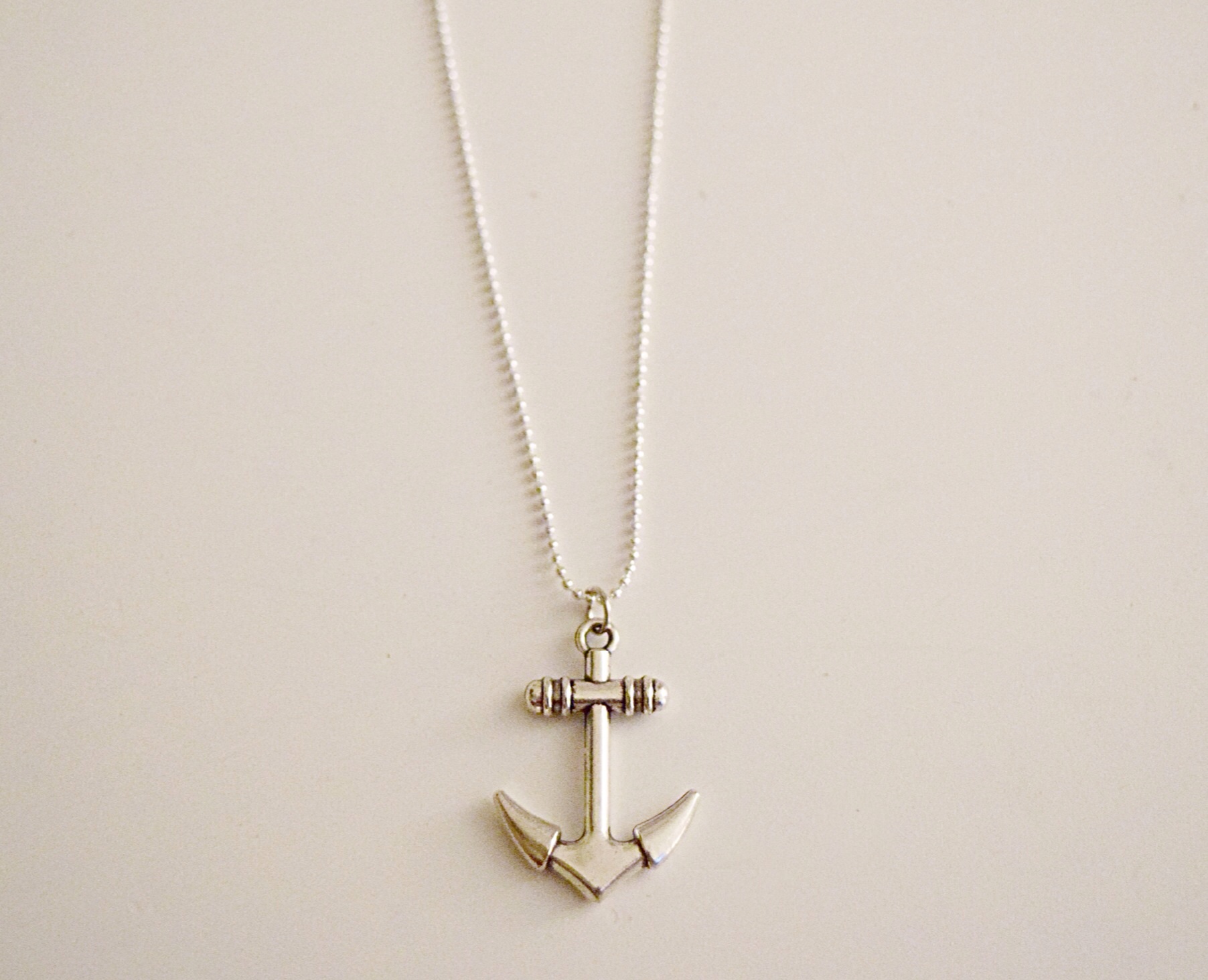 Silver plated anchor charm necklace available on a 24" link chain & 30" bead chain.