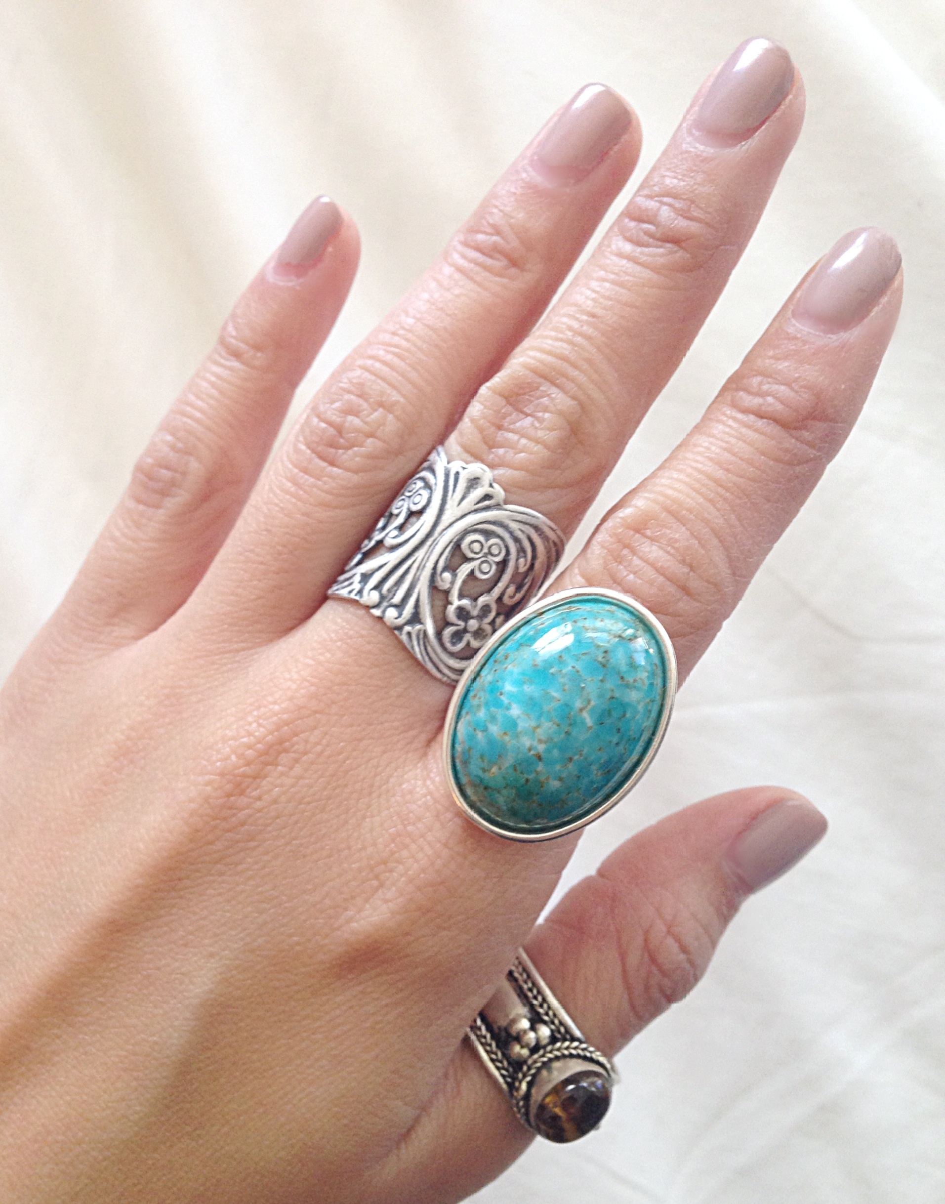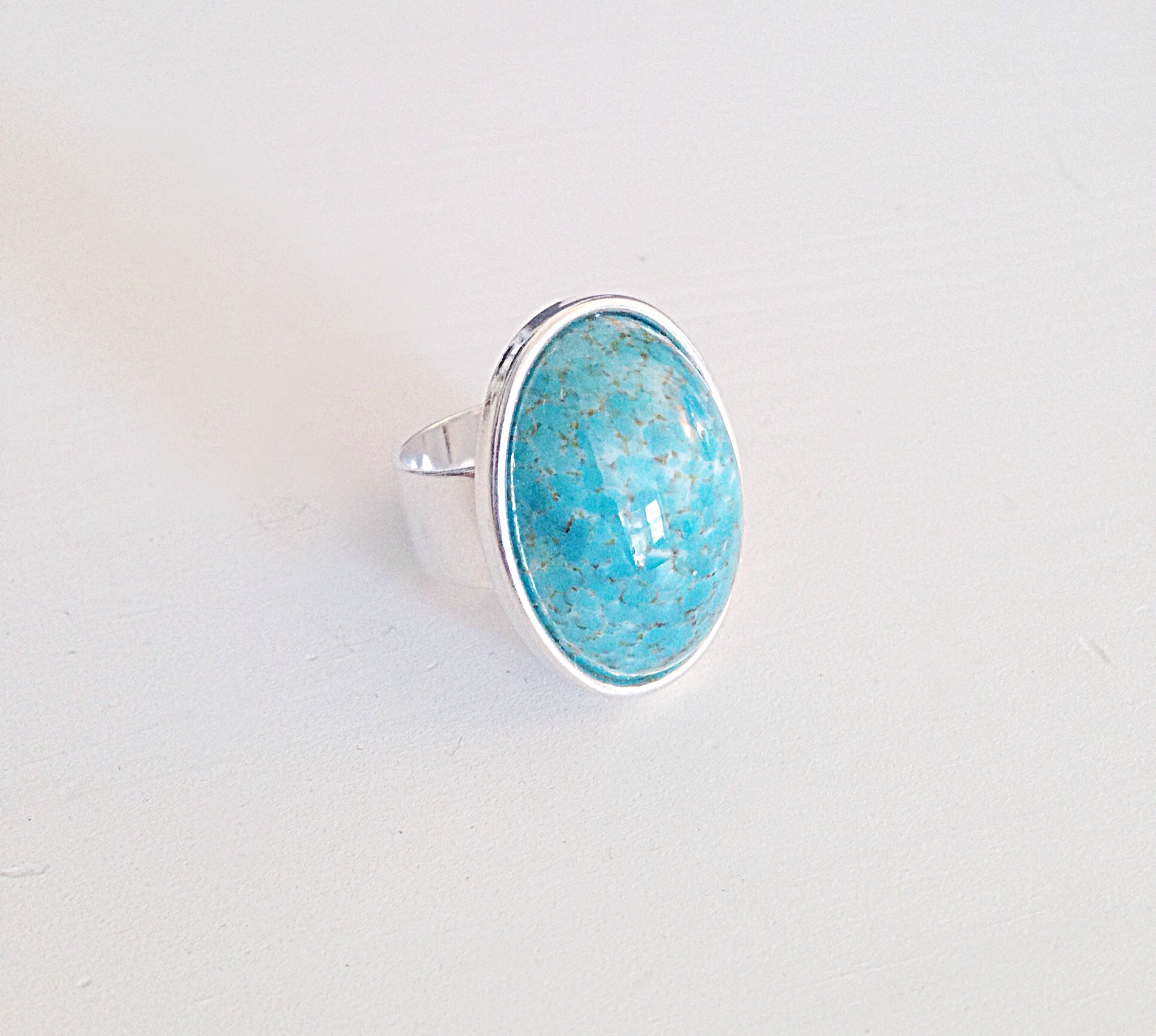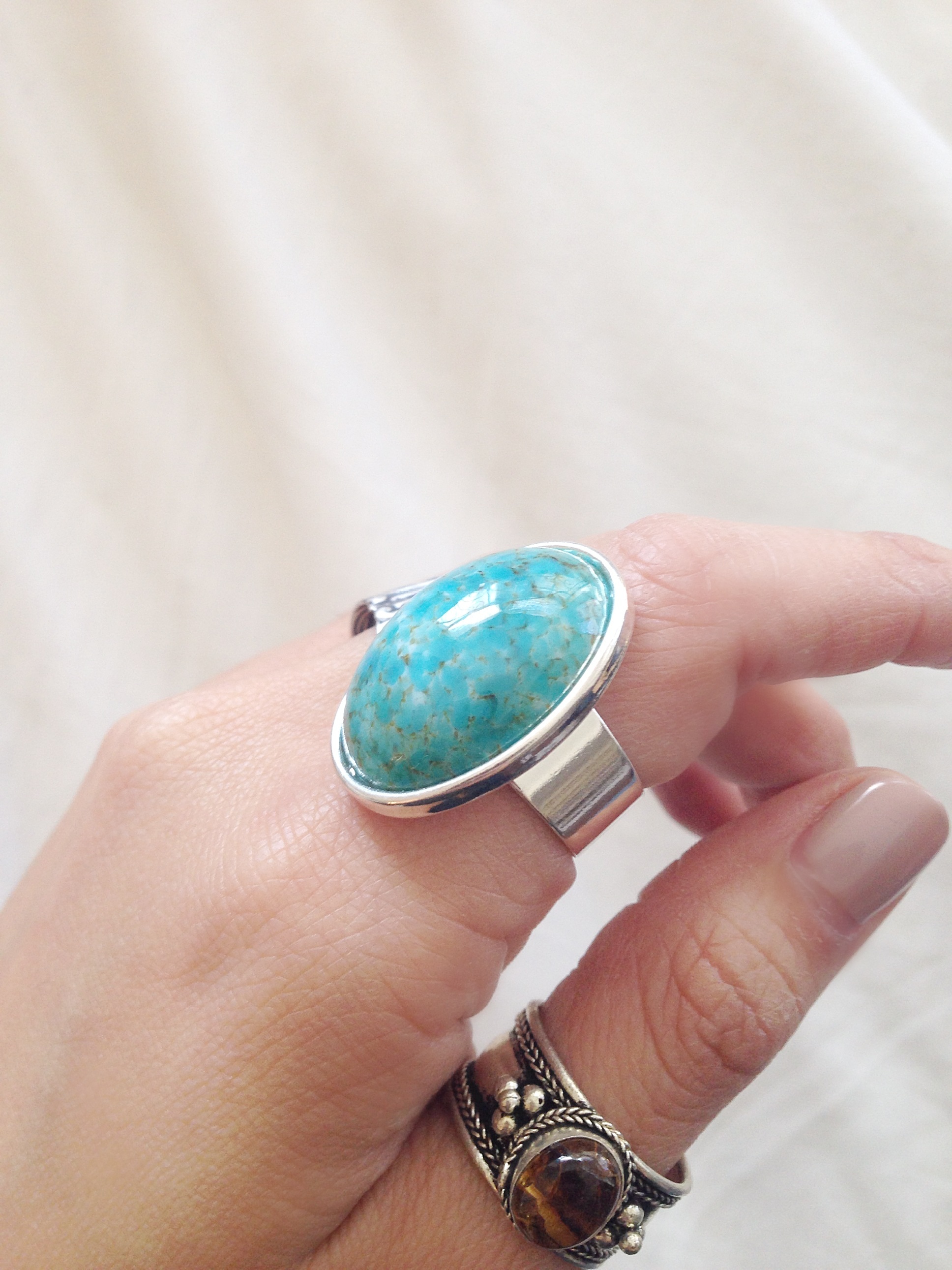 The Britt Ring: Large vintage teal matrix stone set in an adjustable wide-band silver plated ring.