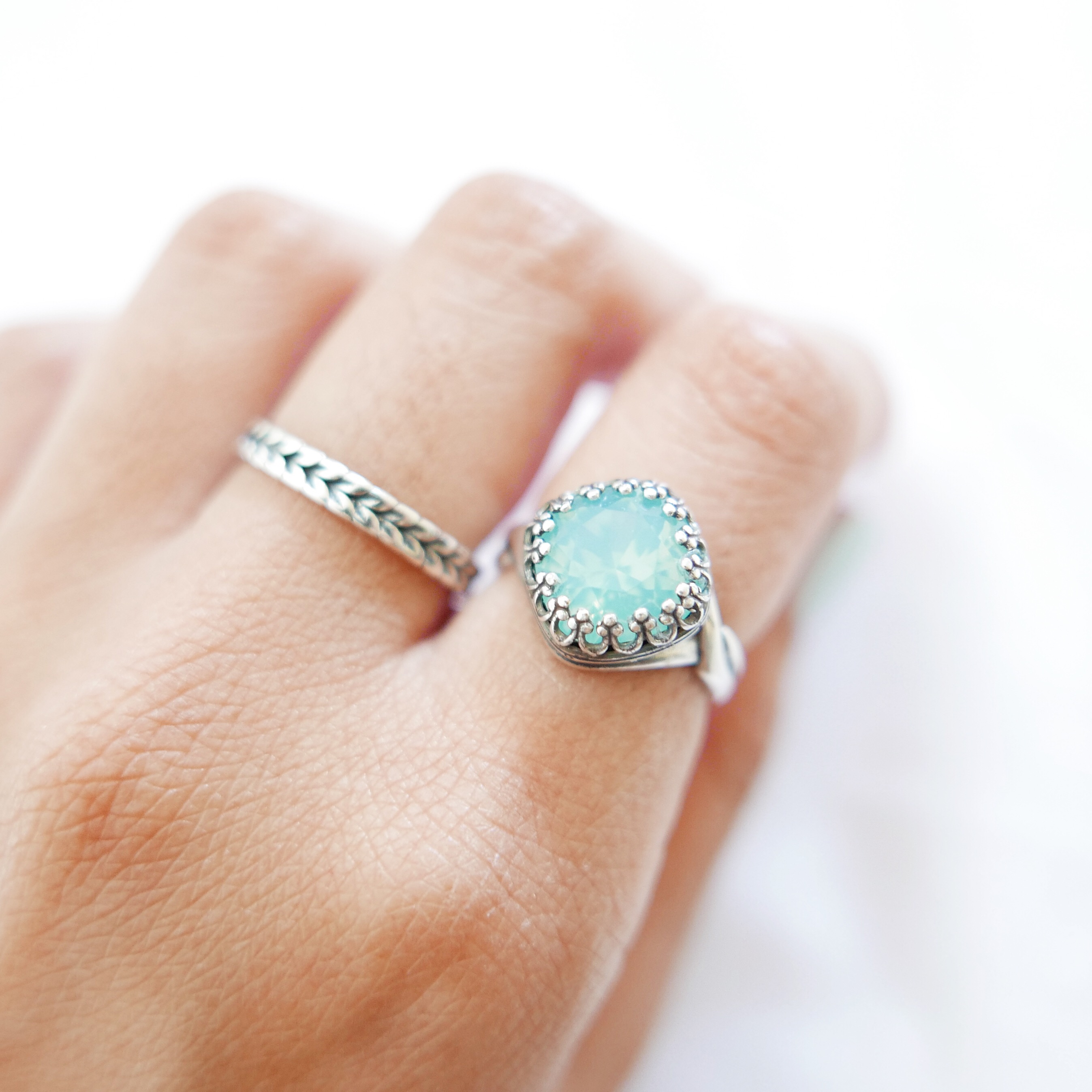 Pacific opal Swarovski Crystal Set into an adjustable silver plated ring.