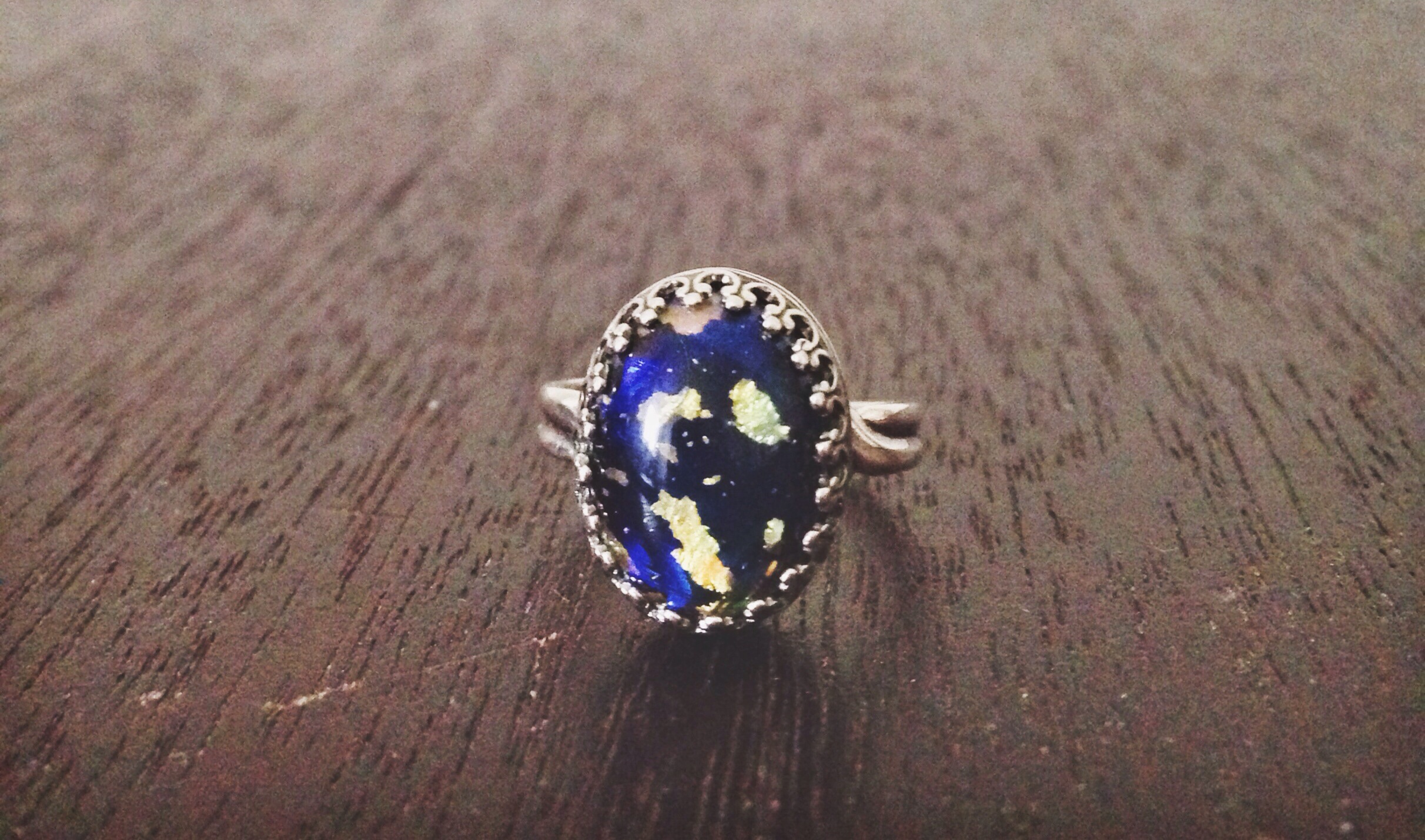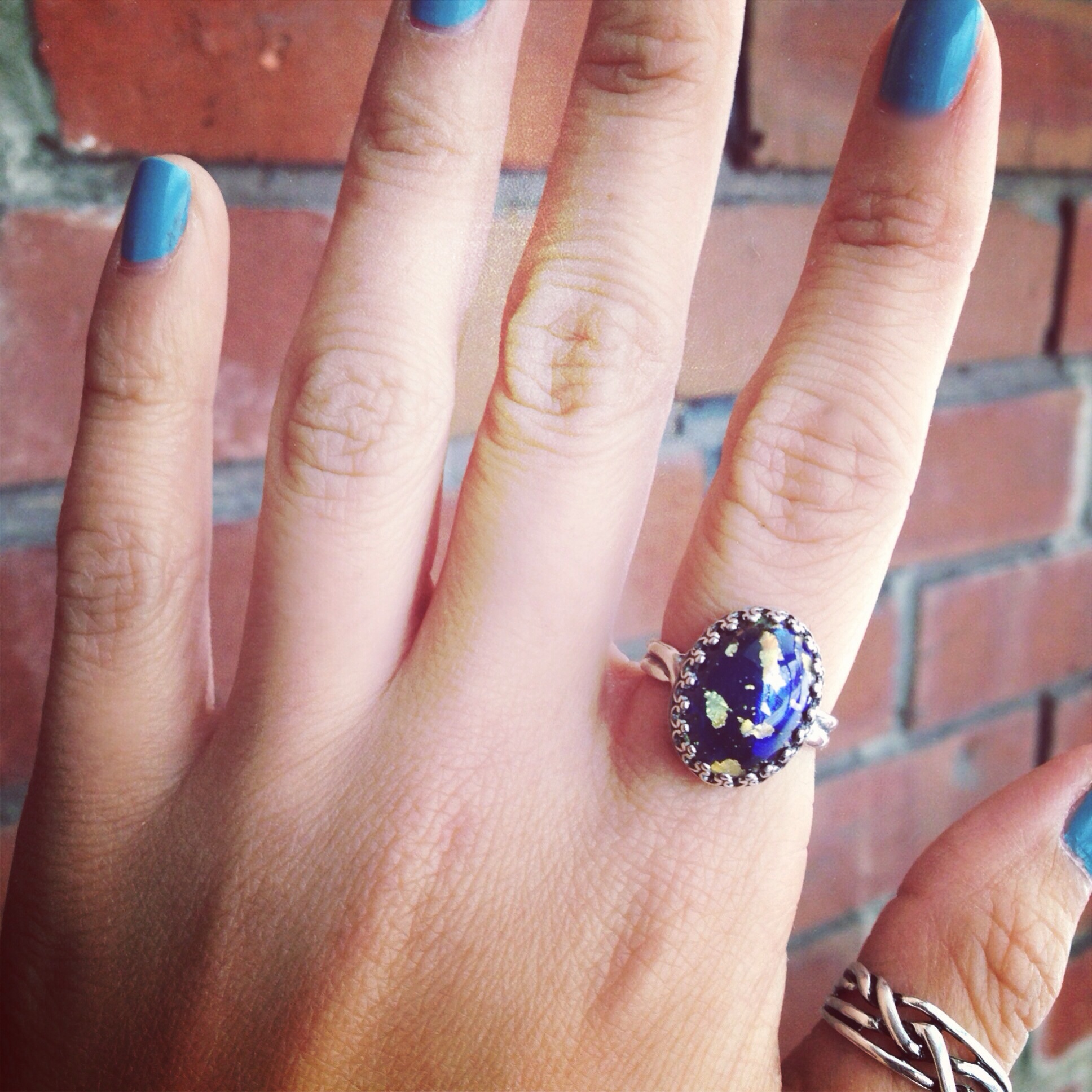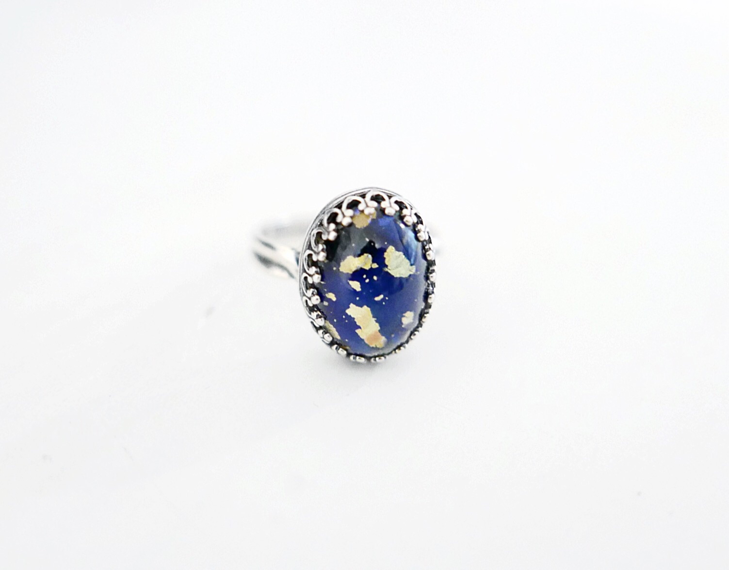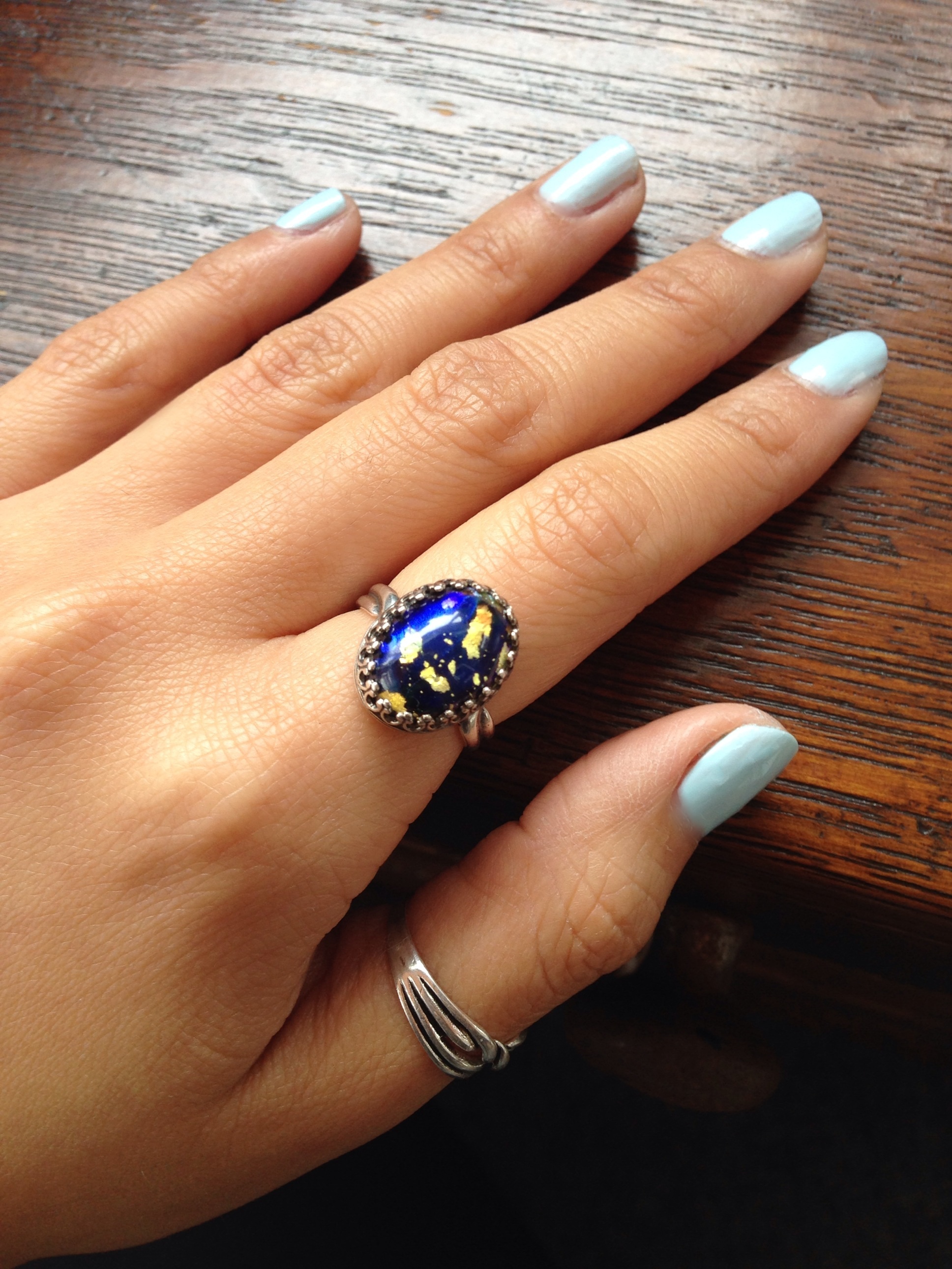 Vintage blue fire opal adjustable ring. This stone has flecks of gold and a hint of green. Stone measures 10mmx14mm