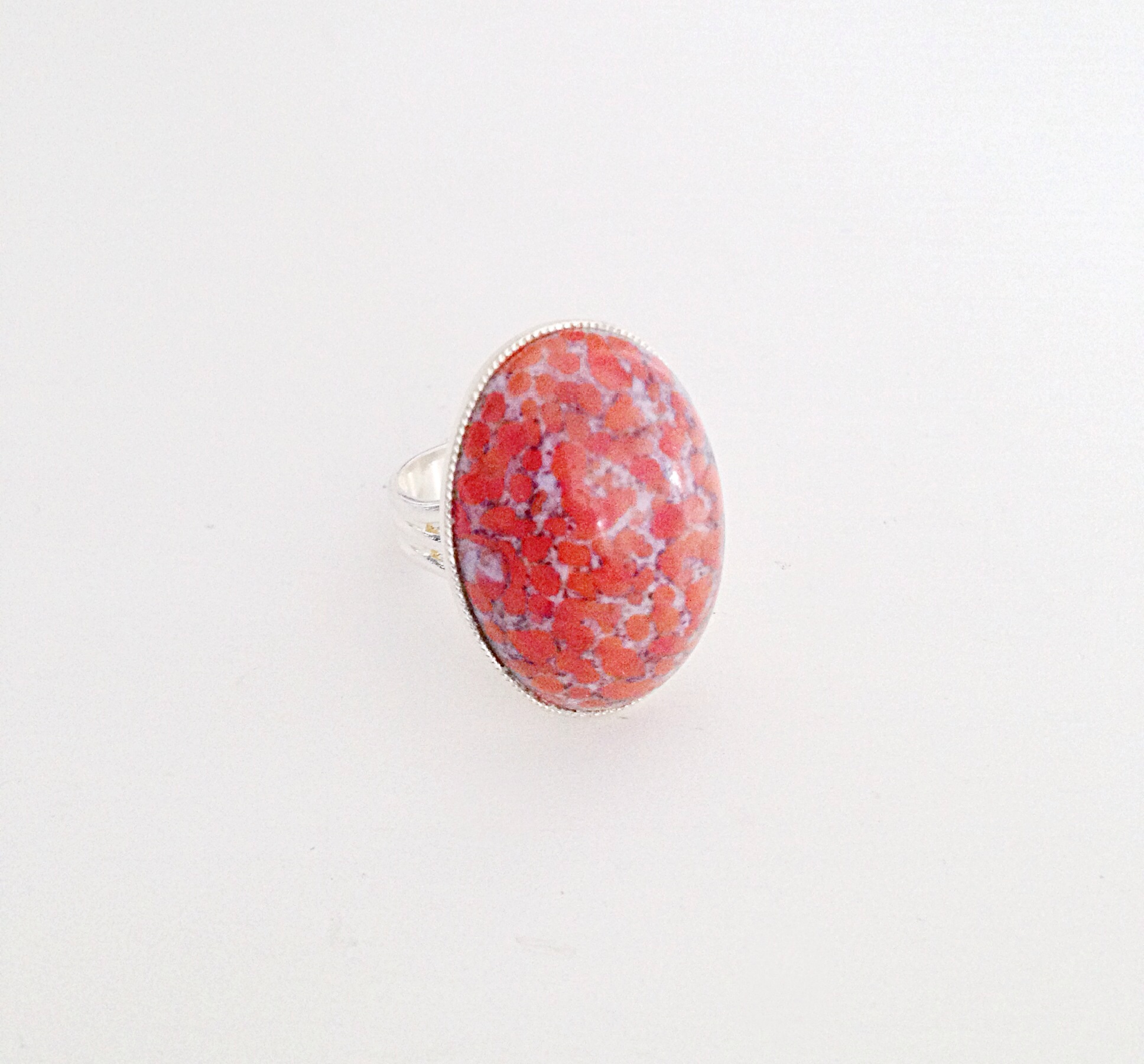 The "Colleen" ring: • Vintage large coral matrix stone set in an adjustable silver plated ring. • Also available in matte gold plated- please request at checkout.