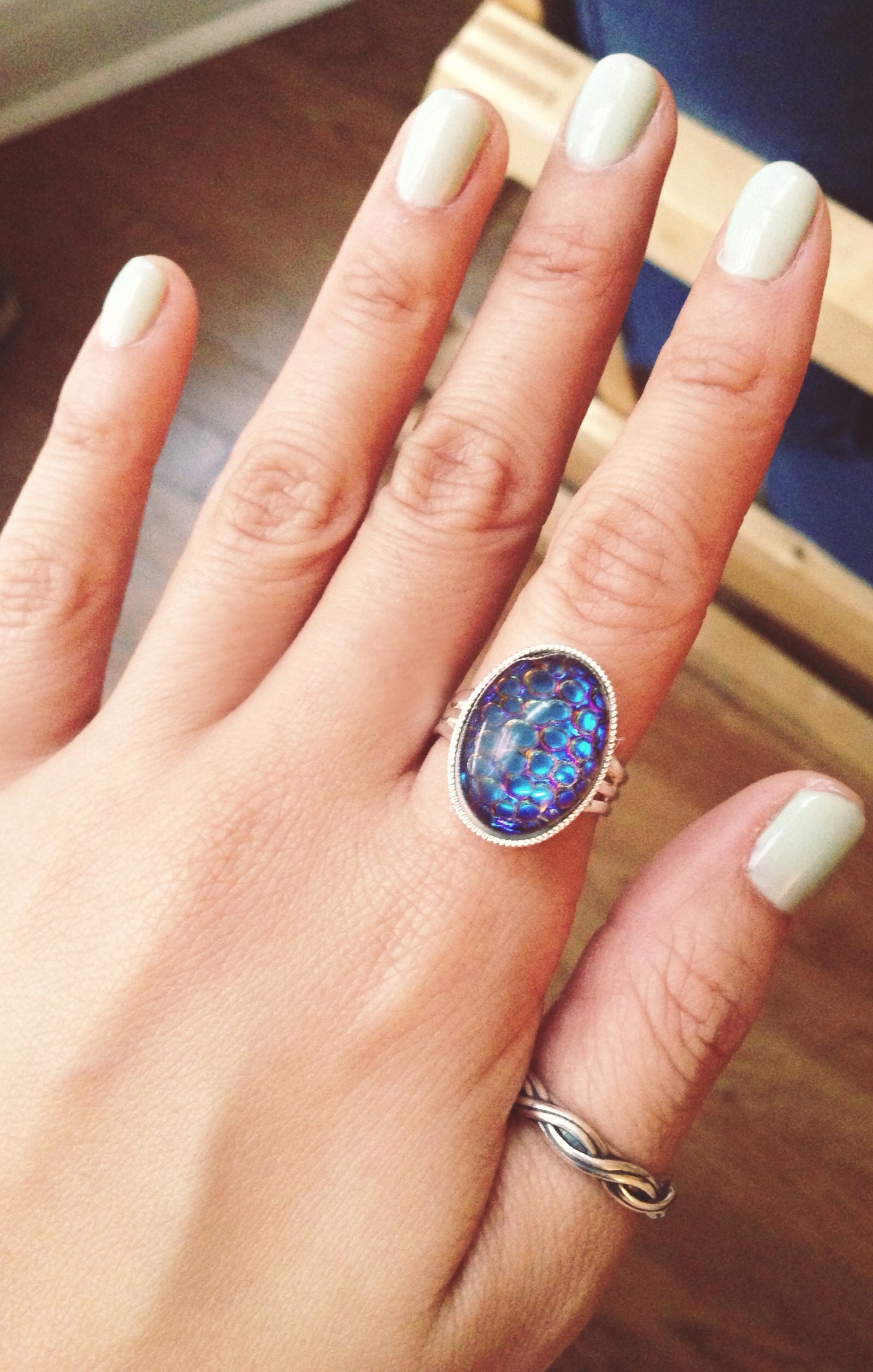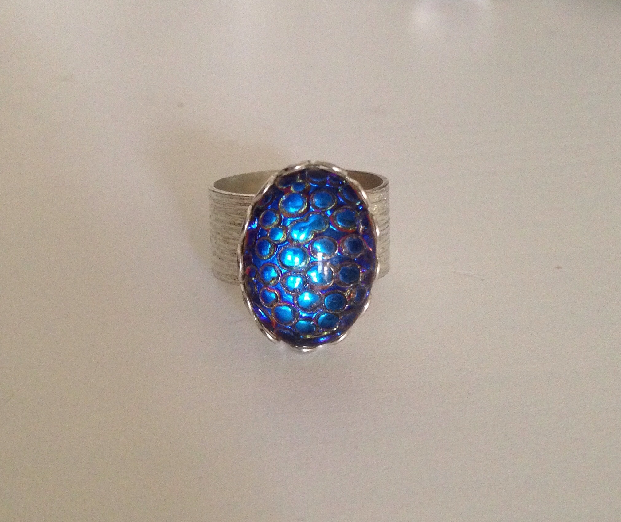 "A thousand eyes" snakeskin mosaic opal ring. This stone has shades of green, blue, aqua and violet when moved in different directions and in various lighting. •Wide band •Adjustable •Silver plated