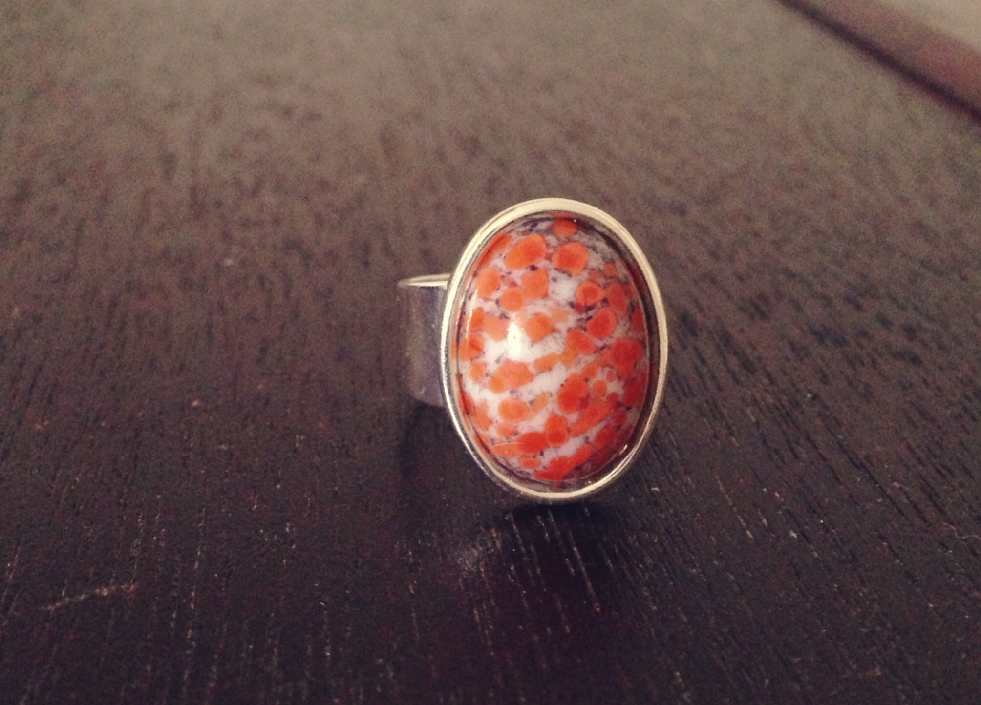 The "Caroline" ring: • Coral matrix stone • Adjustable wide band • Silver plated • Stone measures 1.3cmx1.8cm