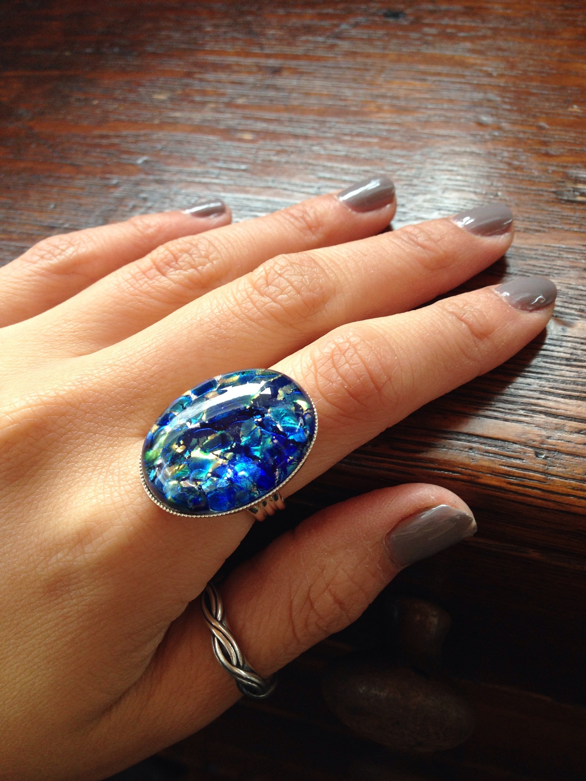 This stone is so so lovely! Large vintage "sea blue" cobalt opal ring. •Adjustable band •Available in silver plated or matte gold plated •1.8cmx2.5cm