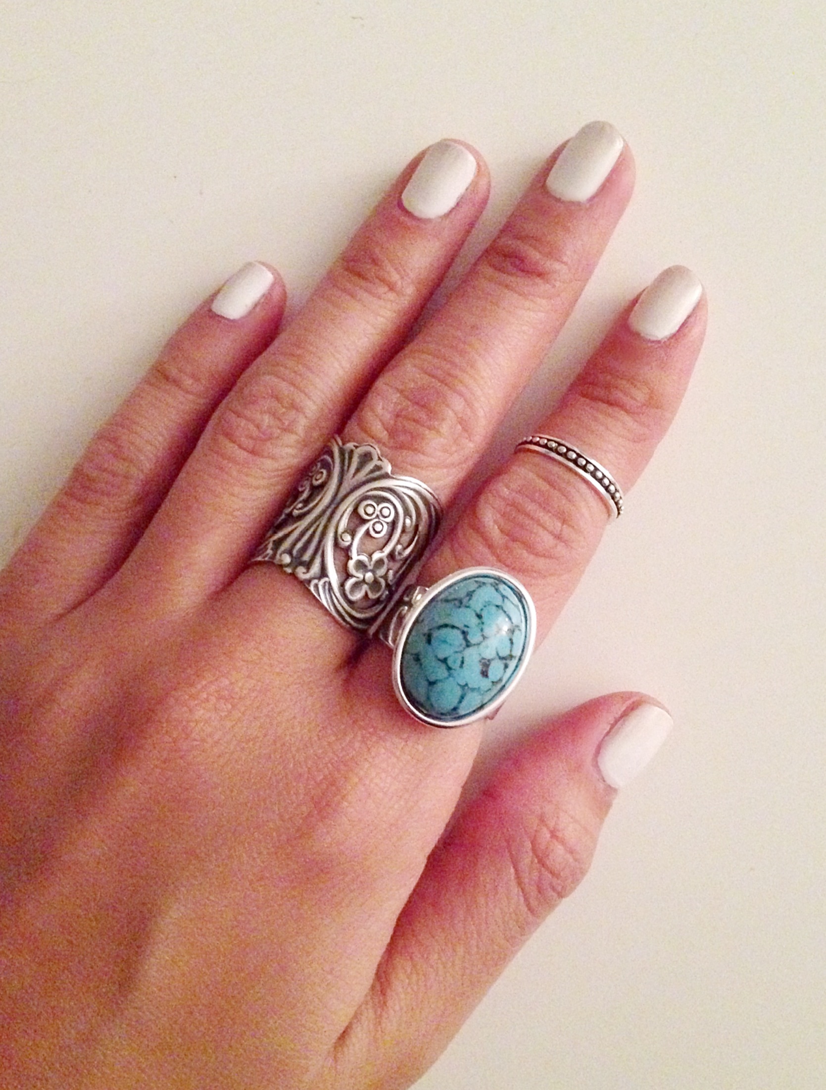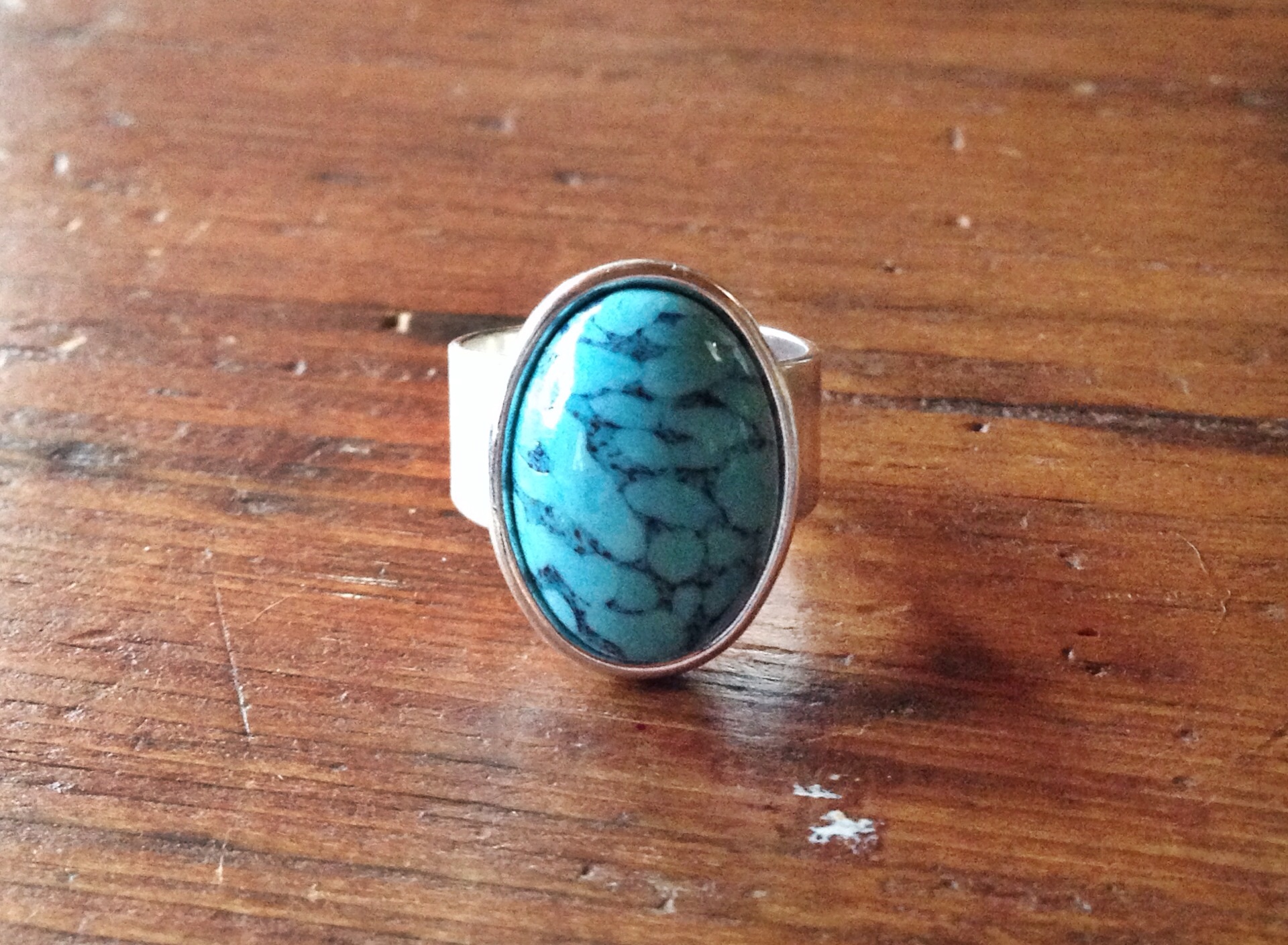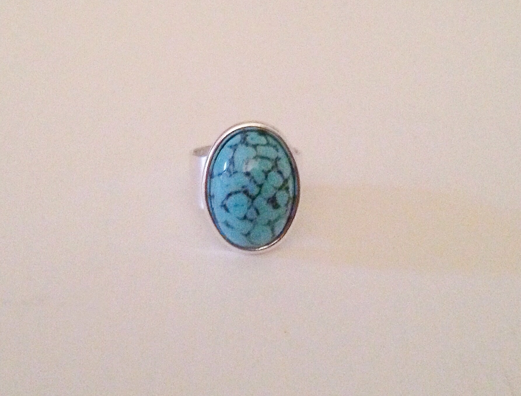 Vintage marbled turquoise stone ring - Adjustable - Silver Plated - Wide band