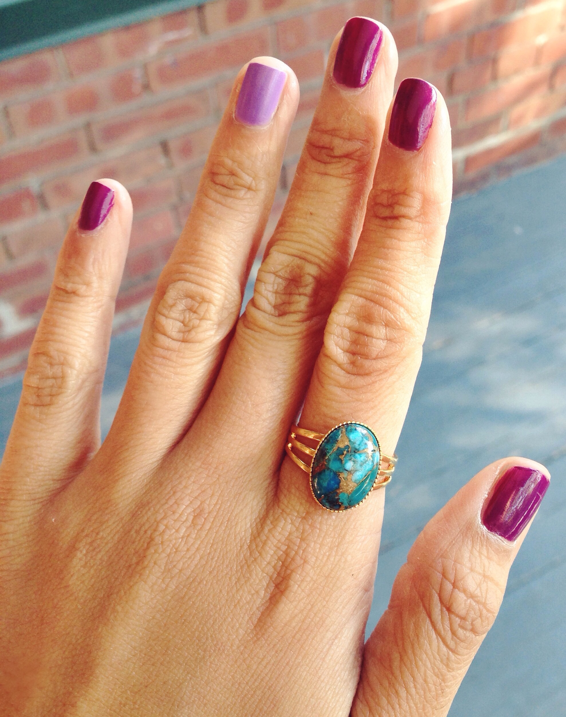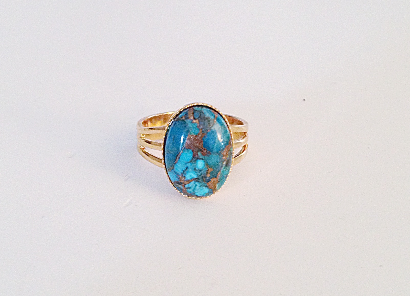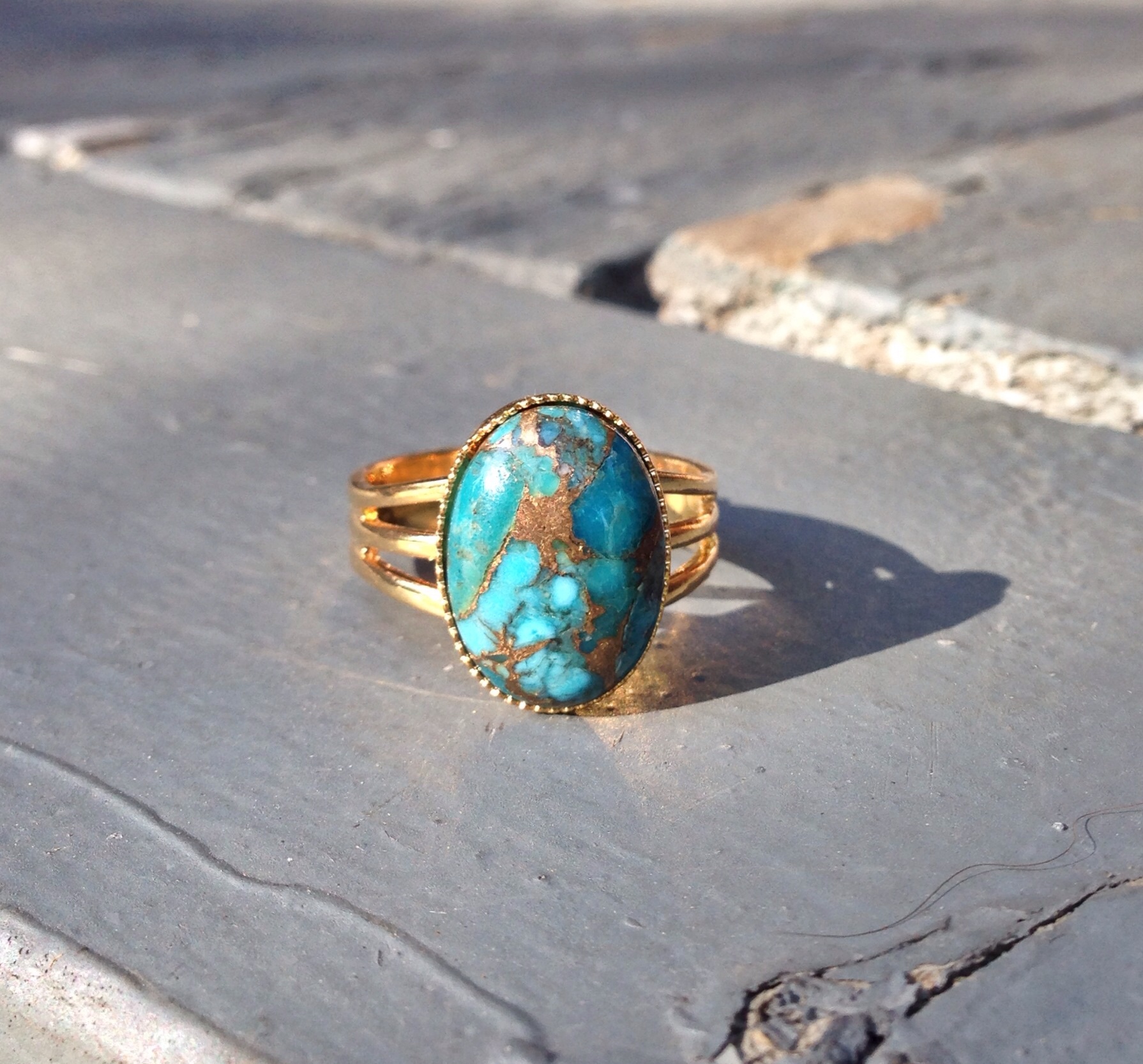 Oval Turquoise copper stone set in an adjustable gold/silver plated. Extremely unique turquoise stone with flecks of gold and stone. Only a few in stock!