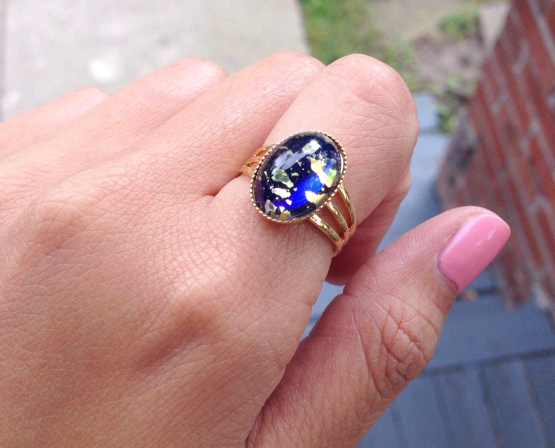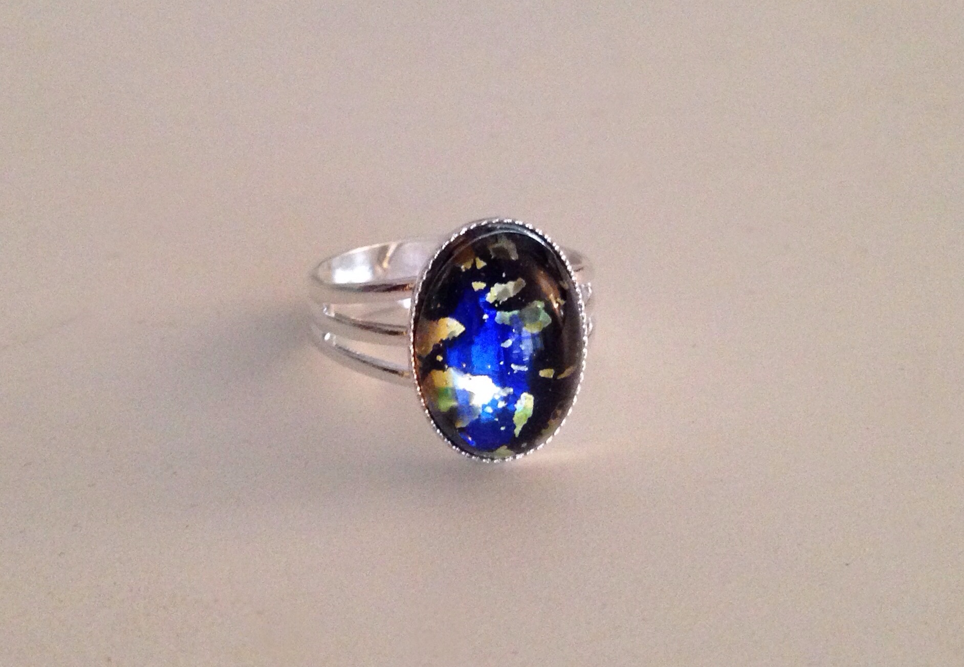 This is the smaller version of the "Sarah" ring. •Blue fire opal •Adjustable band •Available in silver & gold plated
