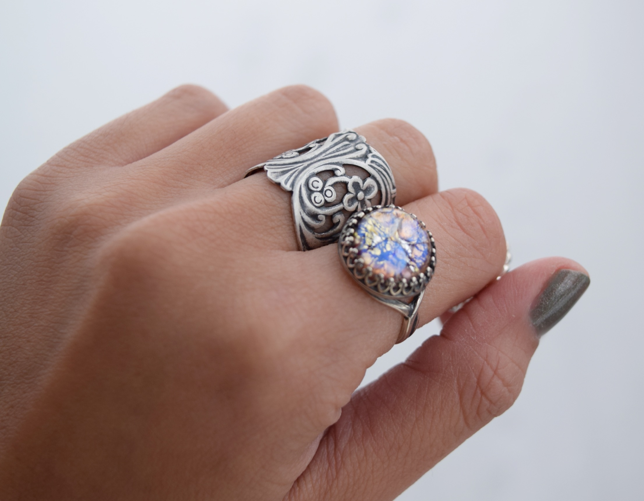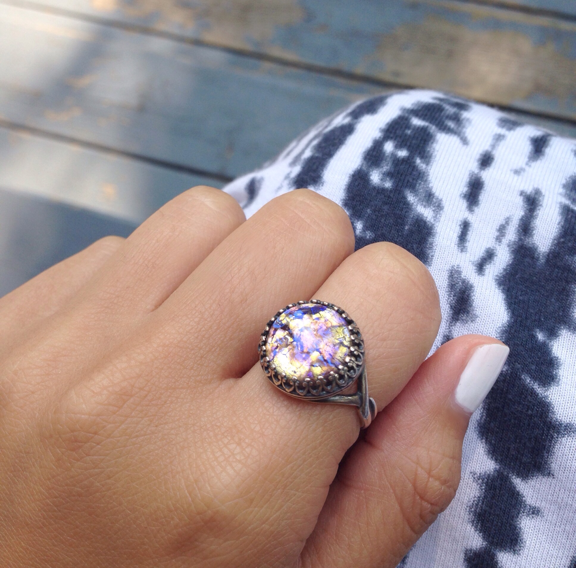 Vintage amethyst opal stone set in an adjustable silver/gold plated ring. • Round stone measures 1.4cmx1.4cm