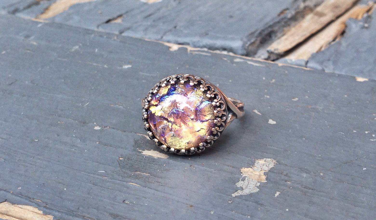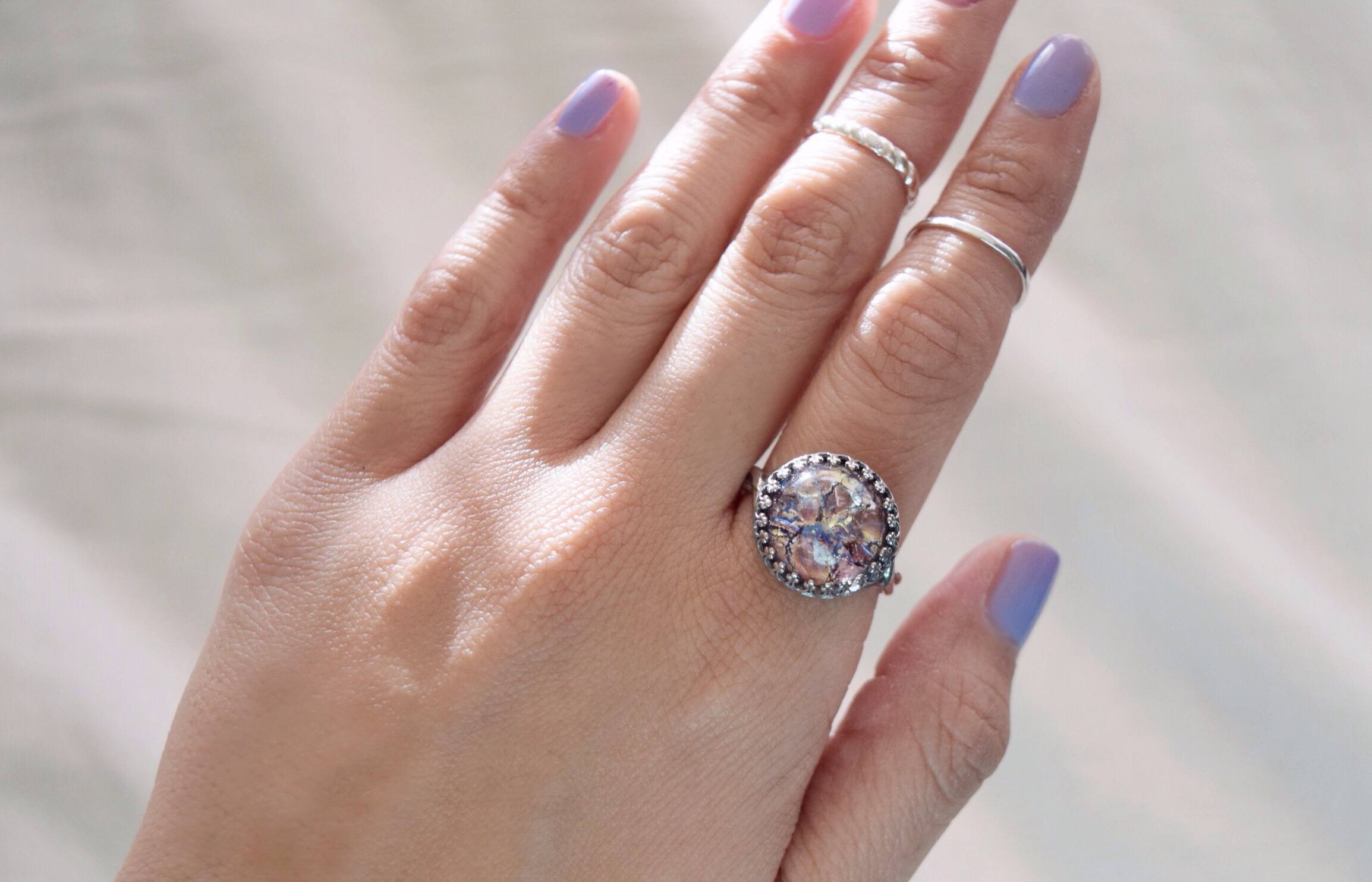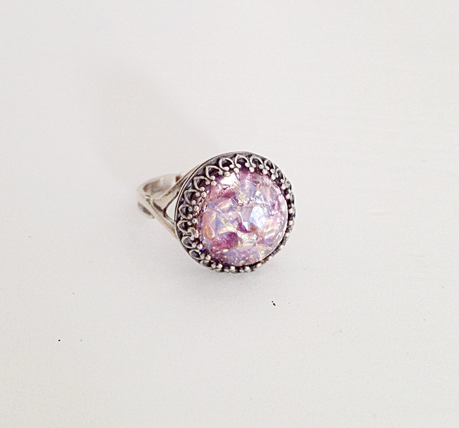 Vintage round amethyst opal stone set in an adjustable 925 sterling silver ring. • The stone measures 14x14mm